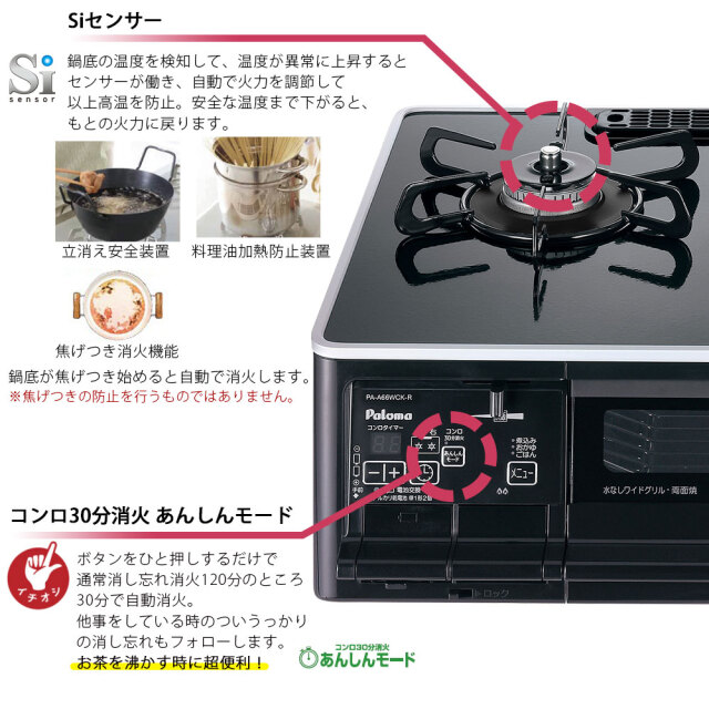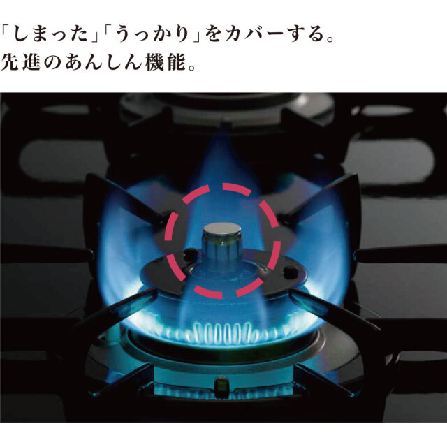 ・調理油過熱防止装置(全口)/立消え安全装置/焦げつき消火機能/コンロ・グリル消し忘れ消火機能