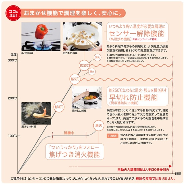 高温炒め機能 /コンロ調理タイマー/温度キープ機能/湯沸し機能